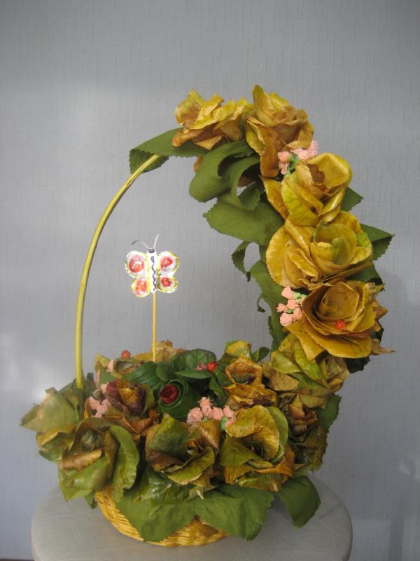 Здравствуйте! Продолжаю выкладывать свои поделки. Эта поделка сделана к конкурсу, который проходил в детском саду моей племянницы этой осенью (в сентябре) и назывался конкурс "Лучший осенний букет". Племяшке всего 2 года, поэтому особо она мне ничем помочь не могла, только разве что особым "порядком" на столе :-), так что делали мы эту поделку вместе с племянником. Так как мы долго и муторно не могли пристроить племяшку в садик и когда, наконец, это свершилось, решили как бы творчески отблагодарить. Сразу оговорюсь, что с помощью наших усилий и усилий других родителей, которые тоже приносили свои букеты, группа племяшки заняла 1 место. Воспитательница, которая совсем недавно работает, была очень счастлива и мы тоже ;) .
