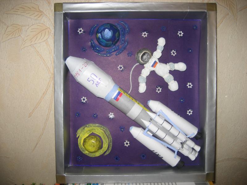 эту поделку мы делали с племянником на День космонавтики в детский сад. Надо сказать немного сложноватая работа, сложно было сделать ракету...даже не сколько сложно, сколько муторно....Космонавта сделали из капронового носка :lol: , набили ватой, перевязали ниточками где надо, покрасили белым канц.корректором (мазилка по-народному) и приклеили лицо будущего космонавта,моего племянника) ;) . Планеты сделали из половинок резиновой аптечной груши (которой сопельки у малышей откачивают) :lol: вообщем вот что получилось