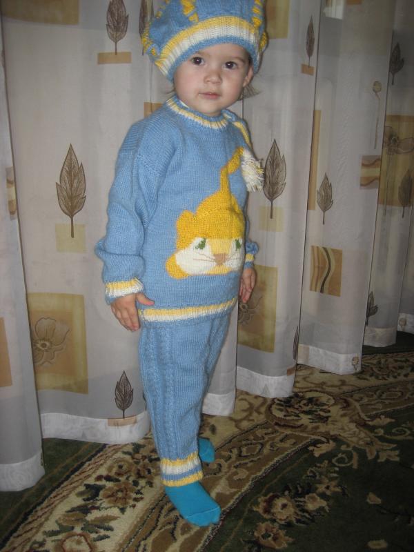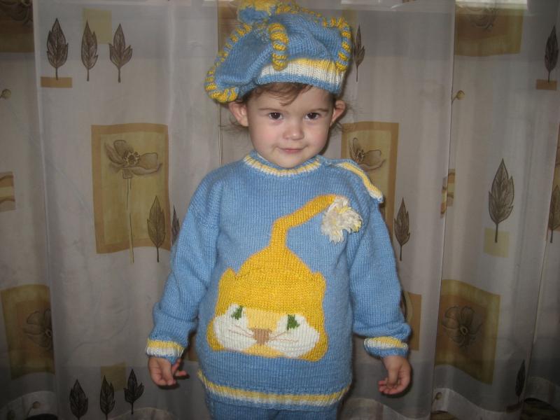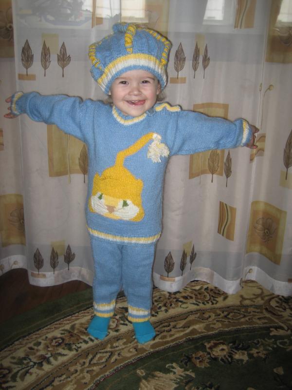 Здравствуйте. Забыла еще одно свое творение выложить (правда категория немного другая). Вязала младшему сыну, но ему пока великовато, а вот племяшке (2 годика) уже похоже в самый раз :-), позировала как настоящая модель :lol: