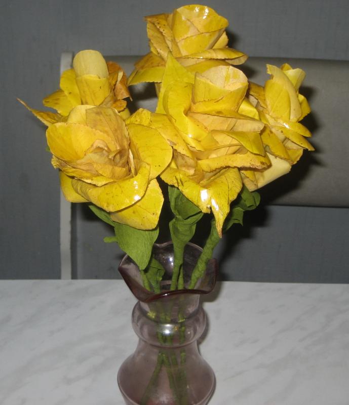 Наш букет, а вернее флористическую композицию, мы назвали "Осенний вальс", идею делать розы из листьев я увидела в интернете, но там листья клена, а так как мы живем в районе приравненном к Крайнему Северу, о кленах можно только мечтать, так что в ход пошли листья березы, тополя. Закругляли ножницами кончик листика и формировали розу. Зеленые листья сделаны из гофробумаги. Розовые цветочки тоже....ну вот что получилось. Мне кажется очень красиво! А да, в конце смазала розы лаком.....ну в некоторых местах, чтобы блестели. Племянник (7 лет) с легкостью потом делал эти розы, главное понять принцип. Попробуйте! :give_heart: ;)