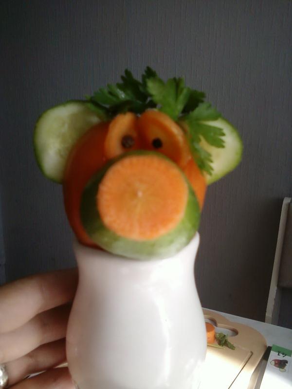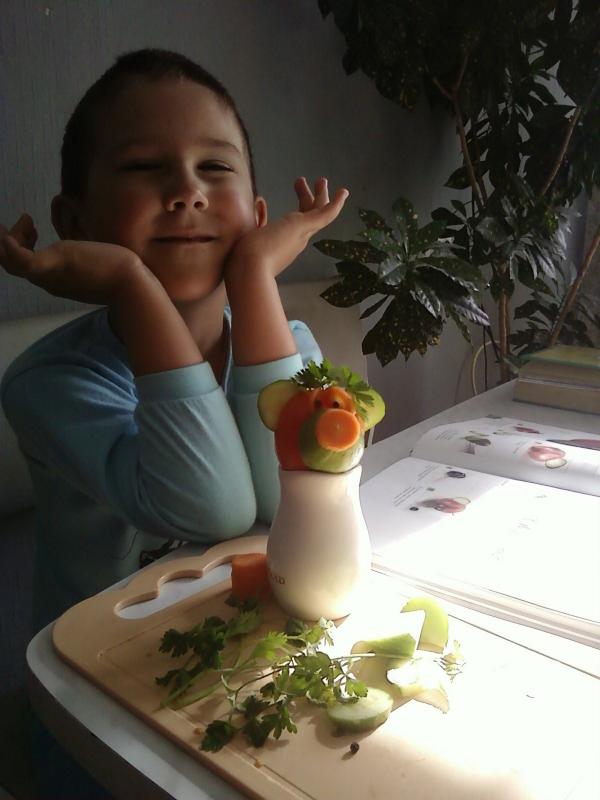 А это на моего сынулю вдохновение нашло. Смотрел, смотрел картинки в книге и решил самостоятельно сделать произведение искусства из овощей. Вот что из этого получилось.. Прошу любить и жаловать - Медведь Мишка :-) . Долго пыхтел над изобретением, особенно сложно было отрезать ровные кружки :-)
