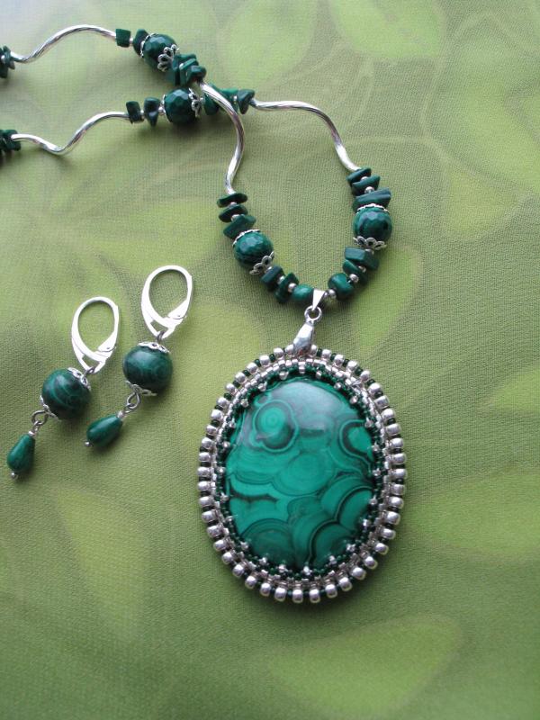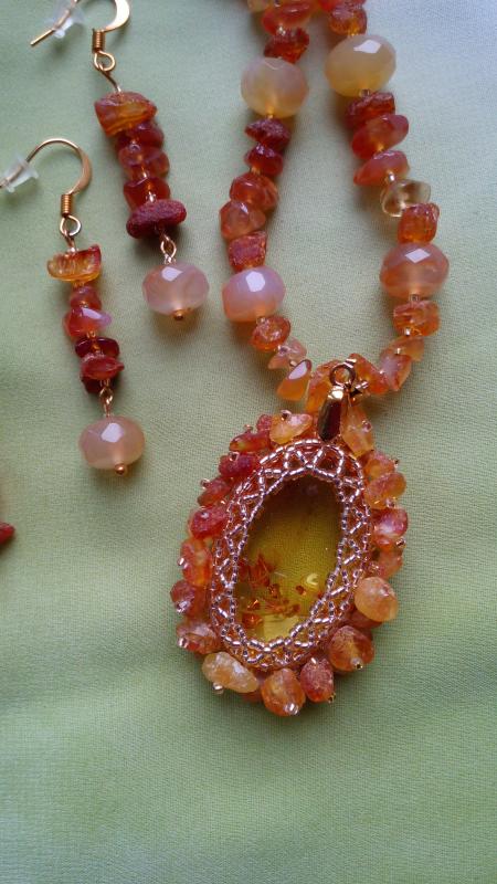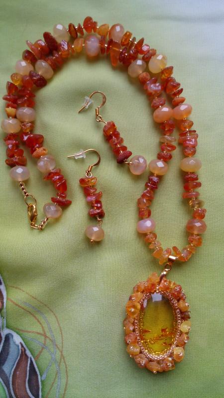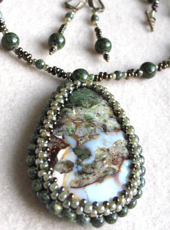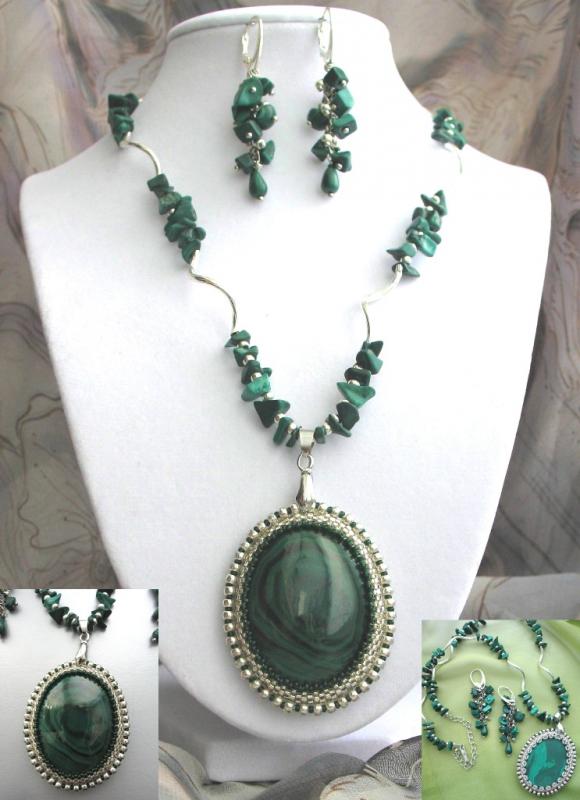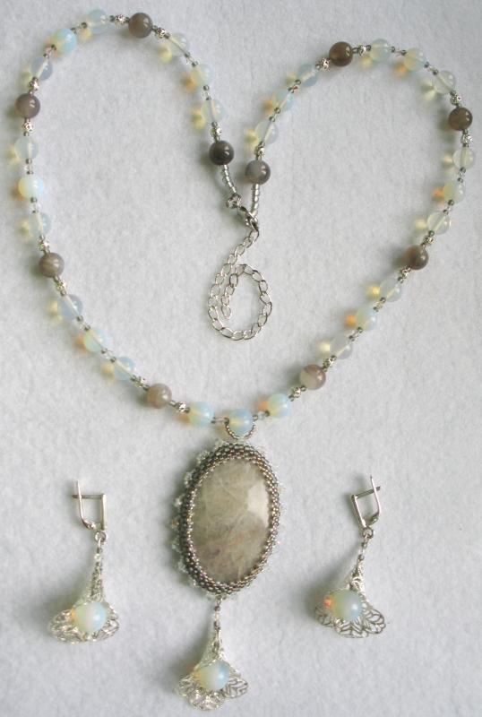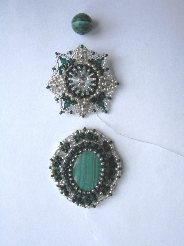 Сама издали посмотрела - считаю, что переходные бусины к трилистникам нужно убрать и приблизить их к центральному кабошону. Ну а вариант выбора подвески под ним - за Вами. Smile