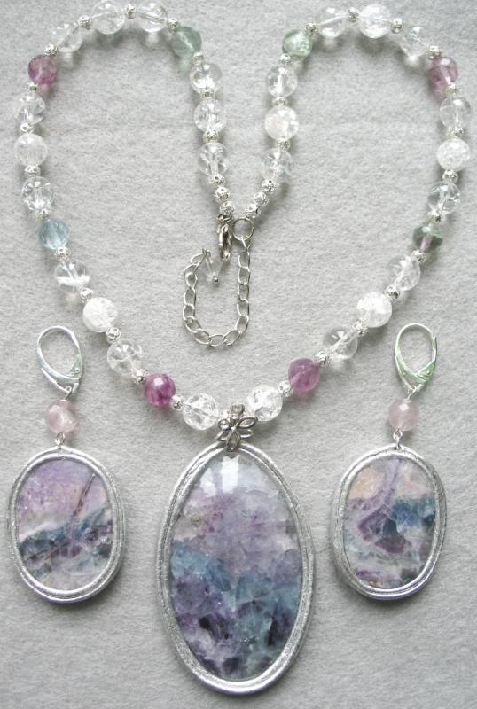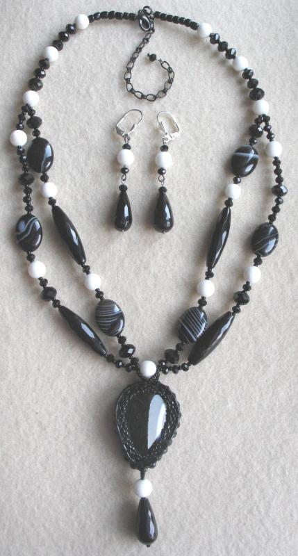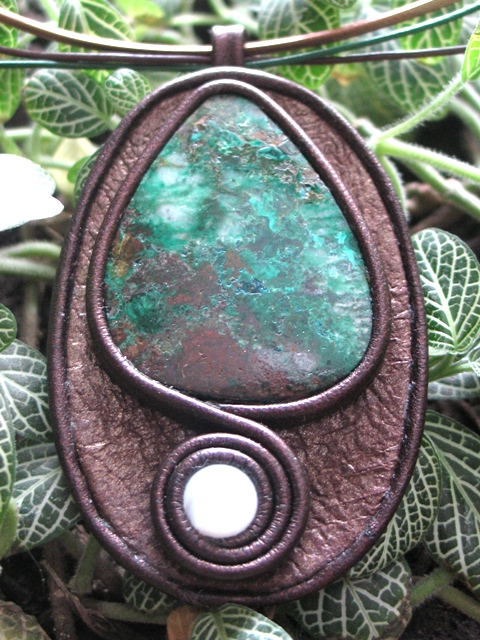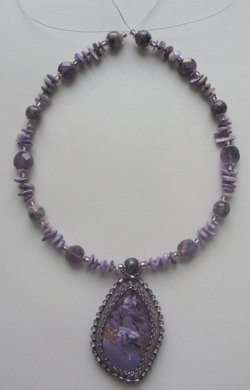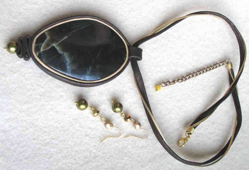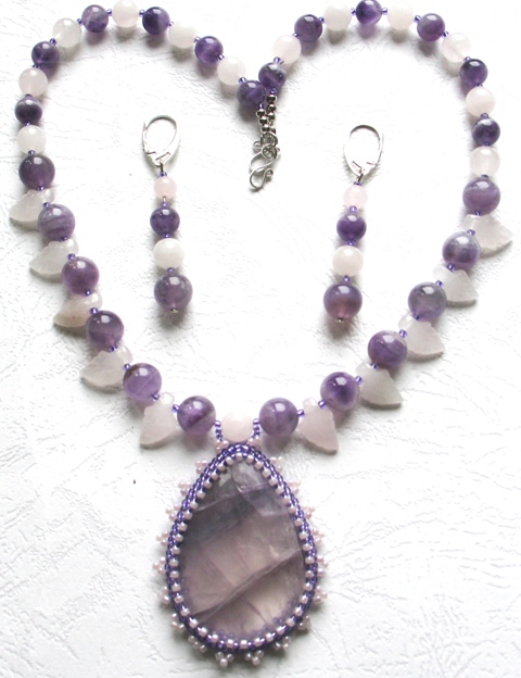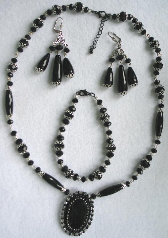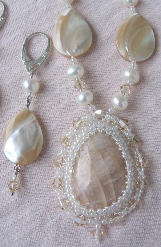 Сама издали посмотрела - считаю, что переходные бусины к трилистникам нужно убрать и приблизить их к центральному кабошону. Ну а вариант выбора подвески под ним - за Вами. Smile