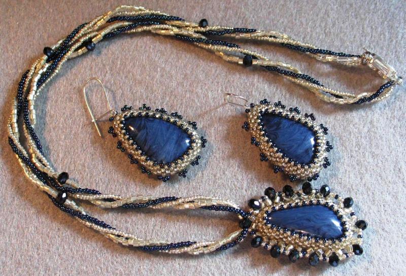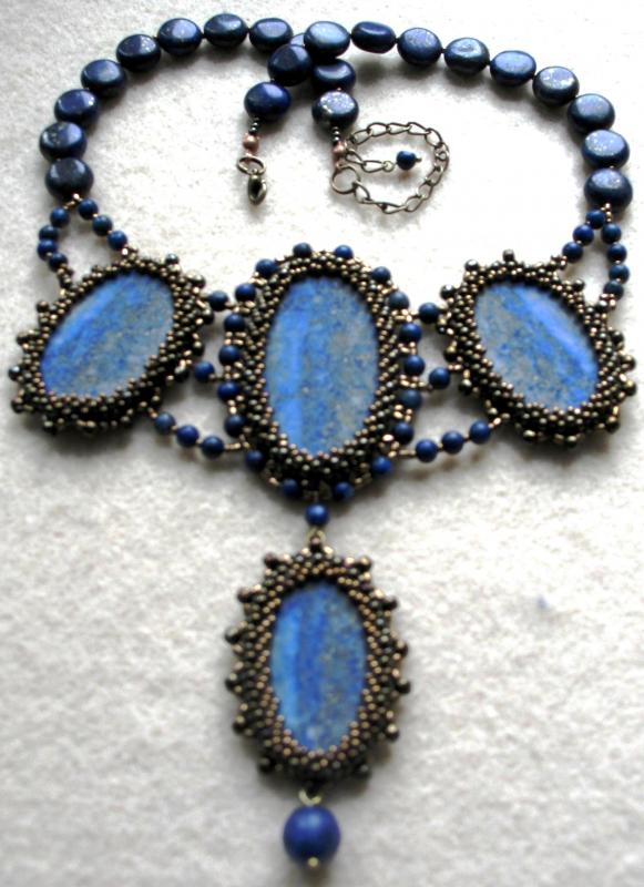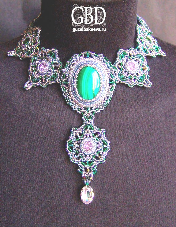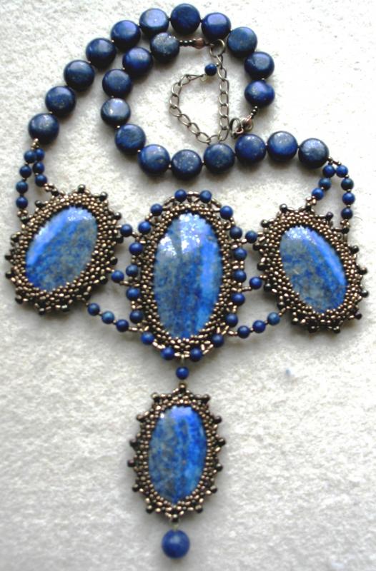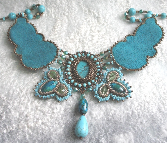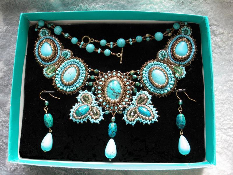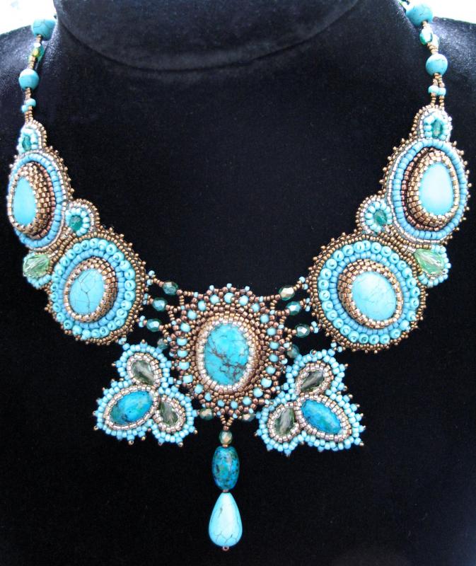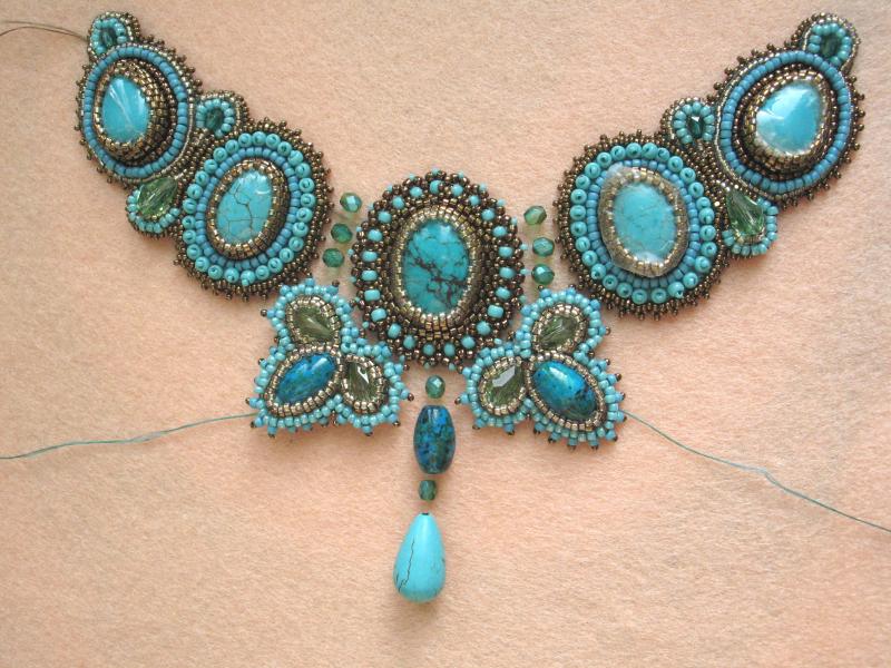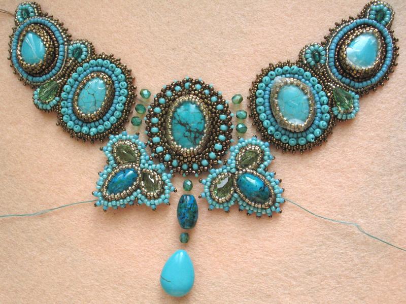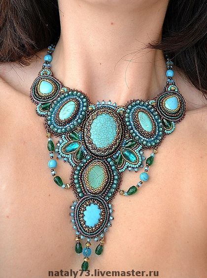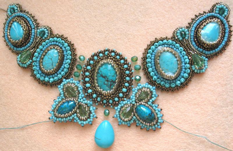 Здравствуйте! Очень интересное и сложное колье! А Вы из каких камней хотели бы подобное колье? В этой работе использованы кабошоны искусственной бирюзы (крашеный говлит) и вышивка по основе, обратная сторона подшита кожей. Так делать легче, но ходить в таких украшениях (на мой взгляд) тяжело, хотя могу и подобное сделать. Но я предпочитаю оплетение. Например вот такое я делала с лазуритами: