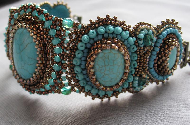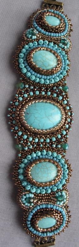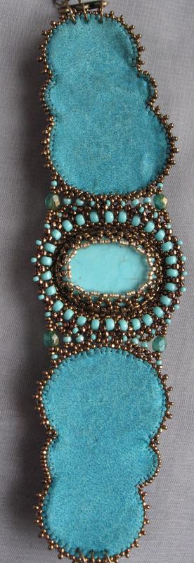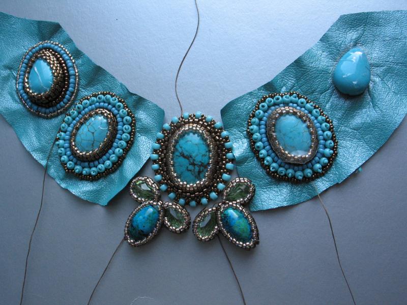 Я пока займусь этим кабошонам. Не хочется клеить его на основу и обшивать - всё-таки натуральная бирюза. Можно сделать облегченный вариант колье - чтобы оно было подвижное, не топорщилось горбом, как это часто бывает(сплошь вышитые колье ведут себя непредсказуемо)