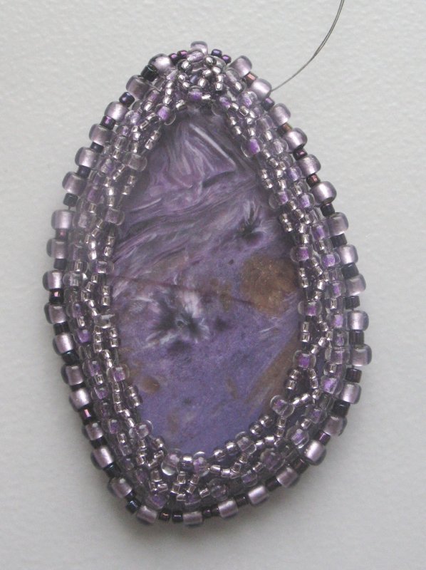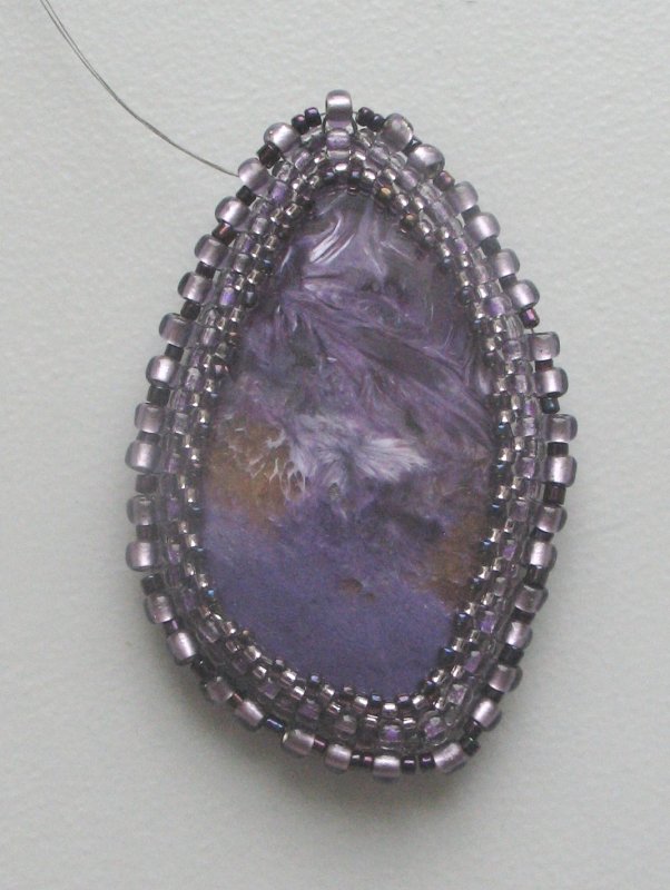 Обшивала мельчайшим бисером-чехом-шарлоттой (мельче - только песок без дырочек Wink ) - для наглядности положила спичку и англ. булавку. К концу процесса глаза вообще отказывались видеть, хоть и с настольной лупой работаю. Но все равно - интересно yes
