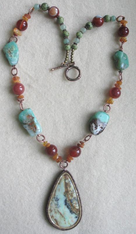 Я бы хотела колье из натуральной бирюзы, зеленые бусины на фотографии, я думаю, стеклянные, тоже удачно вписываются. В общем, как на верхнем фото, только первый ряд камней. Если Вы согласны, давайте со стоимостью определимся и я предоплату могу внести