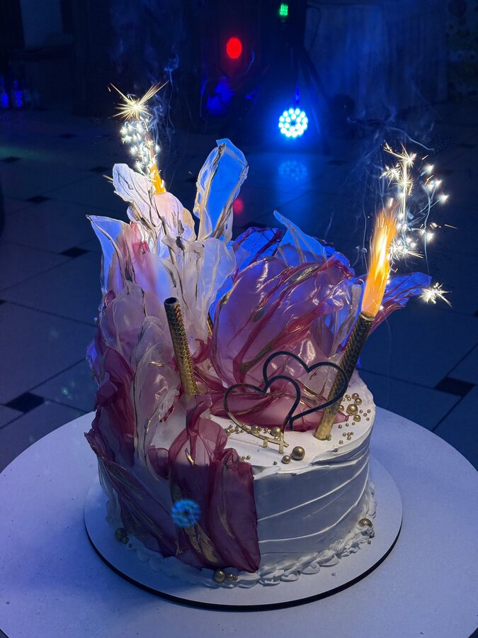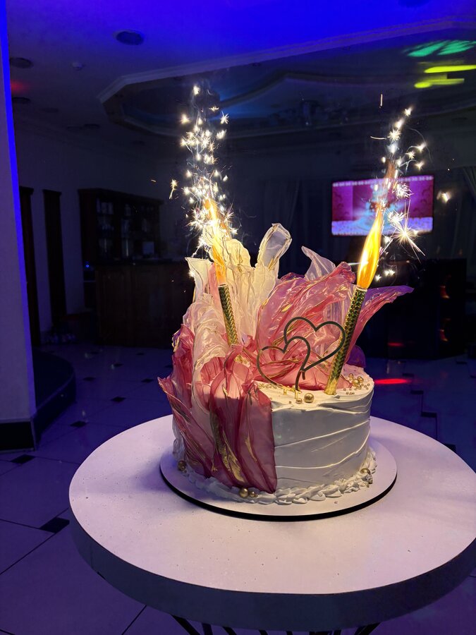 Понравилось как вынесли торт. Может, давно так делают, я не в курсе. Он с зажженными огнями был, смотрелось красиво