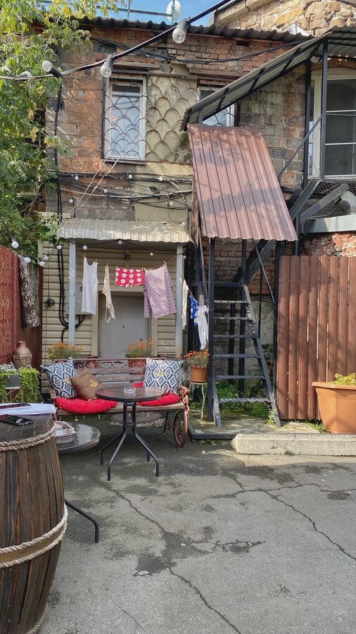 Кафе «Цыплята табака» с многолетней историей - уже не то. Не рекомендую. Цыпленка там делают не под прессом, а просто в духовке. Разочарование. Но интерьер на летней веранде прикольный. Как будто заходишь в какой-то дворик в Грузии, висят ковры, сделан уголок для фотосессии