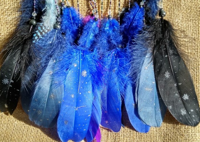 ✨ ЛОВЕЦ СНОВ "ЗВЕЗДЫ". Основа диаметром 20 см, паутина выплетена из темно-синего и угольно-черного бисера, причем расходящимися в разные стороны спиралями, с использованием крученого стекляруса с радужным напылением и хрустальных бусинок. Снизу бусинки хрустальные, деревянные. Перья куриные и гусиные крашеные, гусиные перья вручную расписаны звездами. Общая длина без петли для подвешивания 44 см.