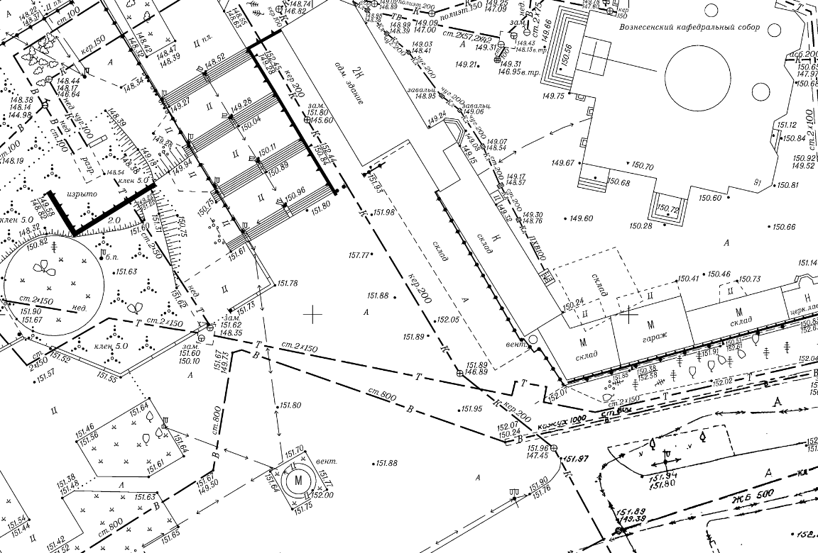 Нашла место это. 151,80 отметка наверху и 148,8 внизу. Перепад высот 3,4 метра. Нормативный пандус делается с уклоном 11%. Т.е. длина у него получится 31 метр. Это можно было бы серпантином сделать, типа как на спуске на набережную сделали с остановки Речной вокзал, но места нет. Справа здание церкви, а слева от лестницы построили кафе-туалет.