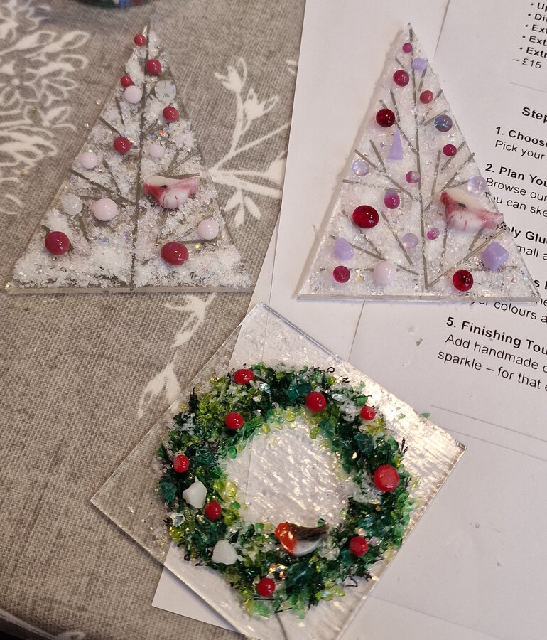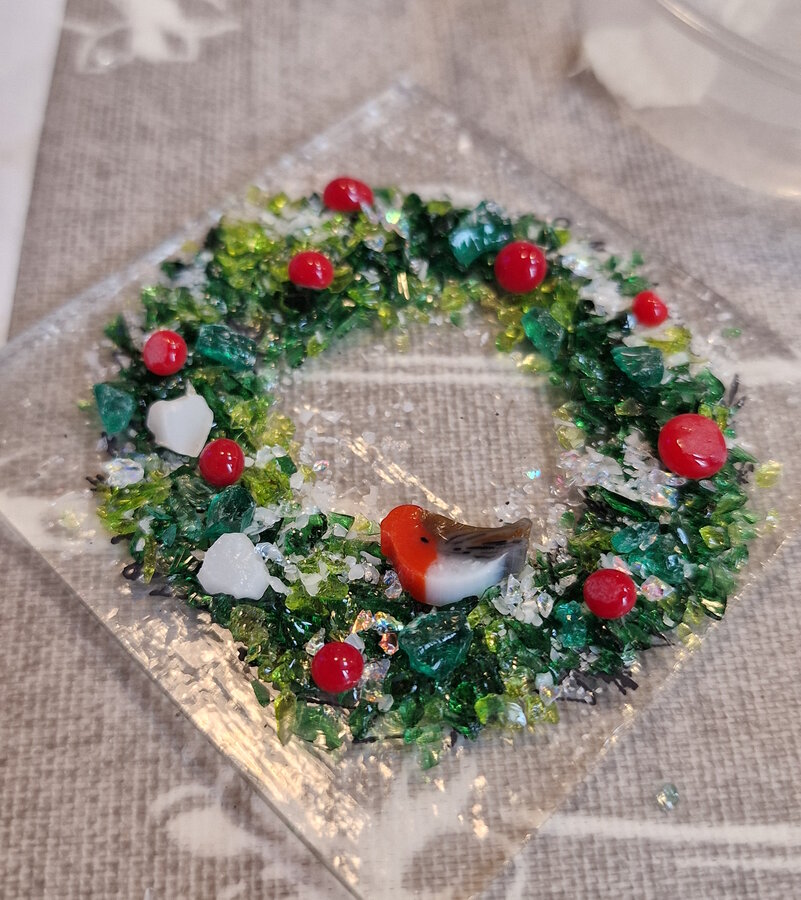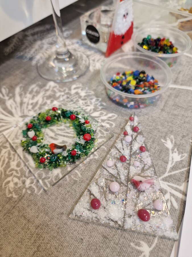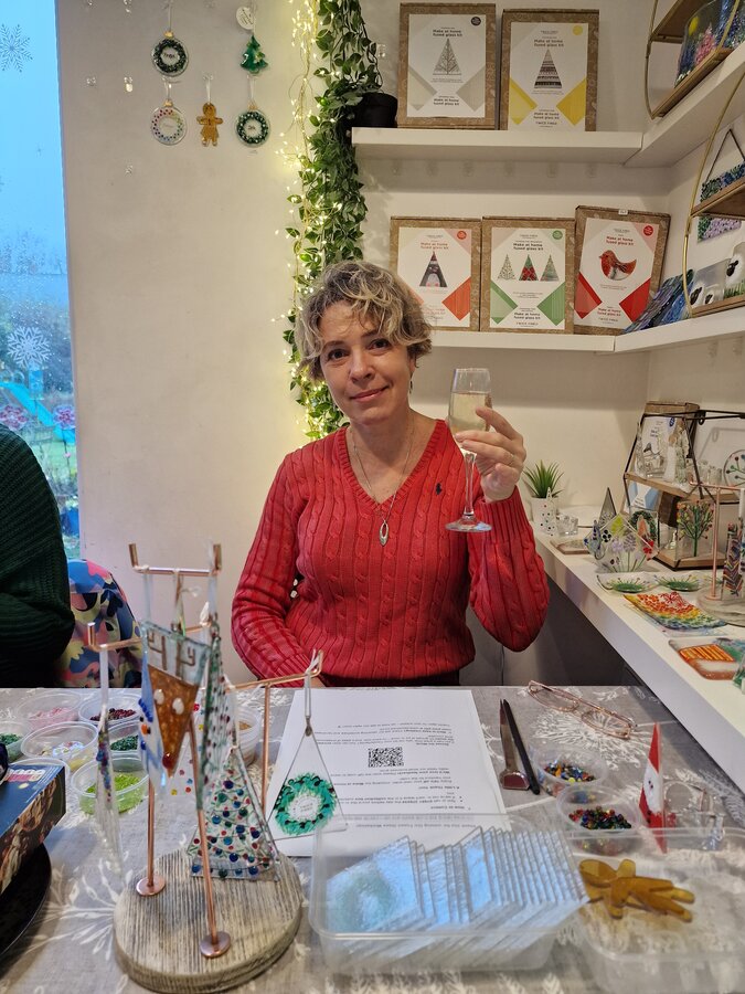 Все проходило в очень уютной предрождественской атмосфере, ну и сама работа со стеклом была увлекательная. Женщина, которая проводит эти классы, оборудовала маленький домик у себя в саду под студию. Там небольшоее помещение, с двумя столами, на 4 человека каждый, красиво оформленные стены, полоъки, печь для обжига. Вот такий мини домашний бизнес. Когда мы пришли, на столах уже вс ебыло разложено, и нам предложиули по бокалу проссеко. Но можно было ограничиться чаем или кофе.