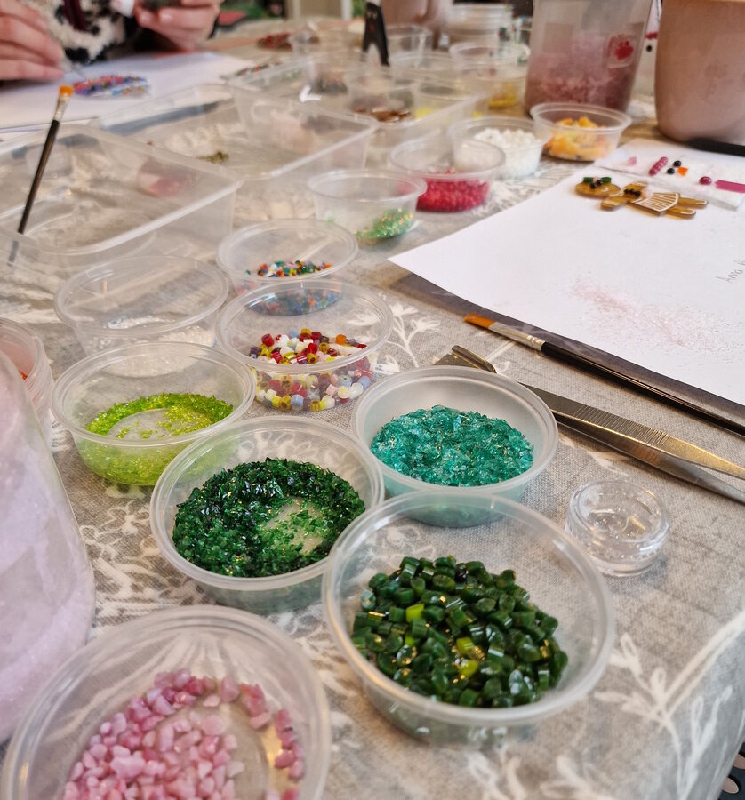 На столе много всяких коробочек с разным стеклом, около каждого лежит кисточка и стоит коробочка с клеем, а еще маленькая лопаточка и пинцетик.