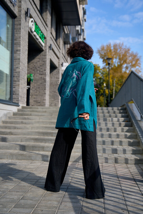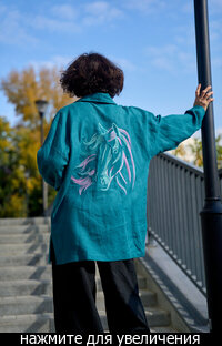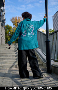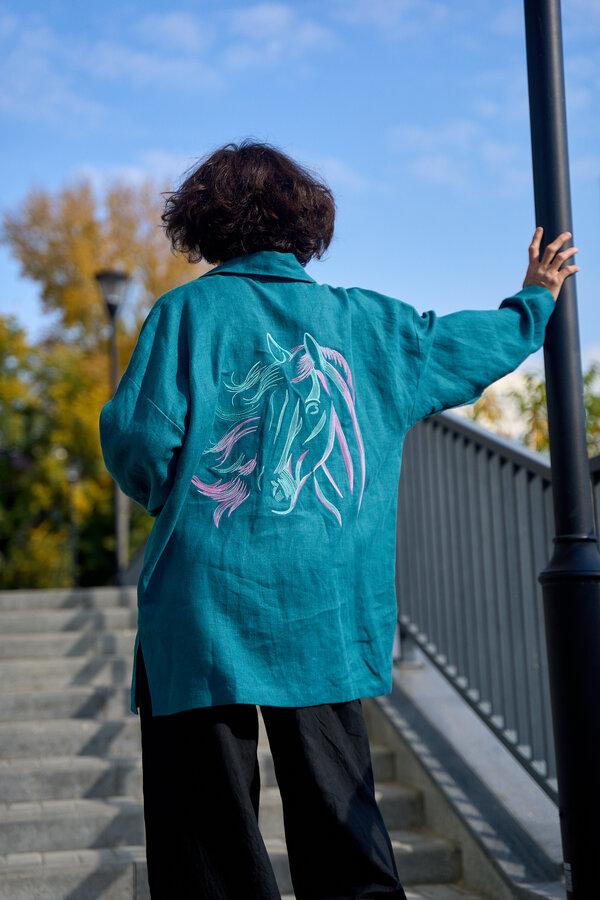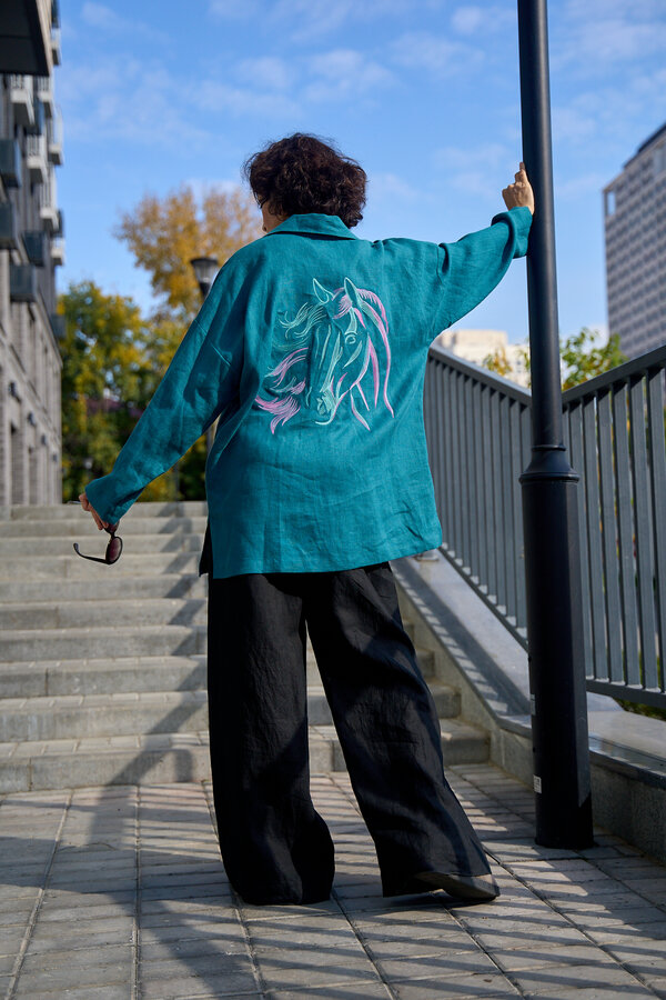 Сейчас: Работаю ]Стильная Рубашка из умягченного льна с лёгким крэш-эффектом цвета "голубая ель" с вышивкой красивой лошадки .