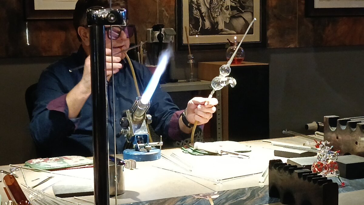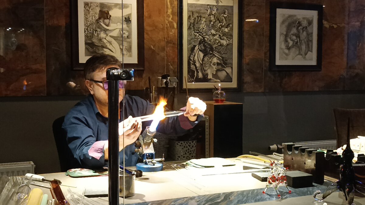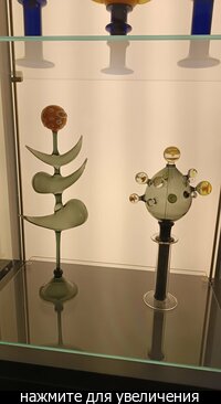 Ирина и Михаил Мвршумовы изначально работали на базе Калинисного стекольного завода,и все пошло от производства лабораторных пробирок. Потом развилось художественное направление. И давно уже нет самого завода и практически не осталось мастеров стеклодувов, именно художников, творцов, но вот сын их творит и вроде повлябются у него ученики. Может и не пропадет мастерство. Изюминка этой техники в том что все элементы продумаются из одного пространства, нет швов, все единое воздушное пространство, нет крепежей.