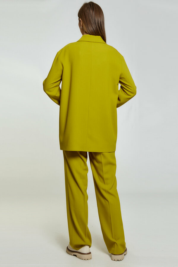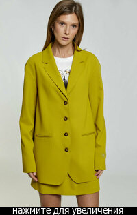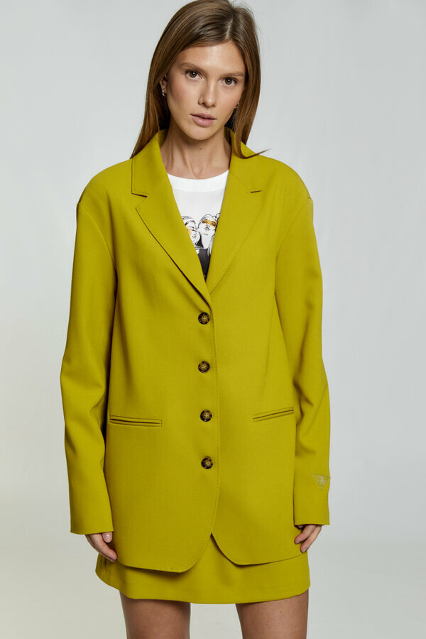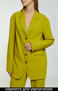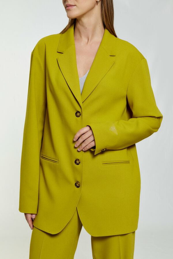 Жакет оверсайз с английским воротником и застежкой на четыре пуговицы. Длина ниже бедер. Рукав удлиненный. NEW PREMIUM QUALITY Костюмная ткань, твил с матовым блеском горчичного цвета (74% терилен,21% район, 5% спандекс) размер 44, цена 3000 руб.