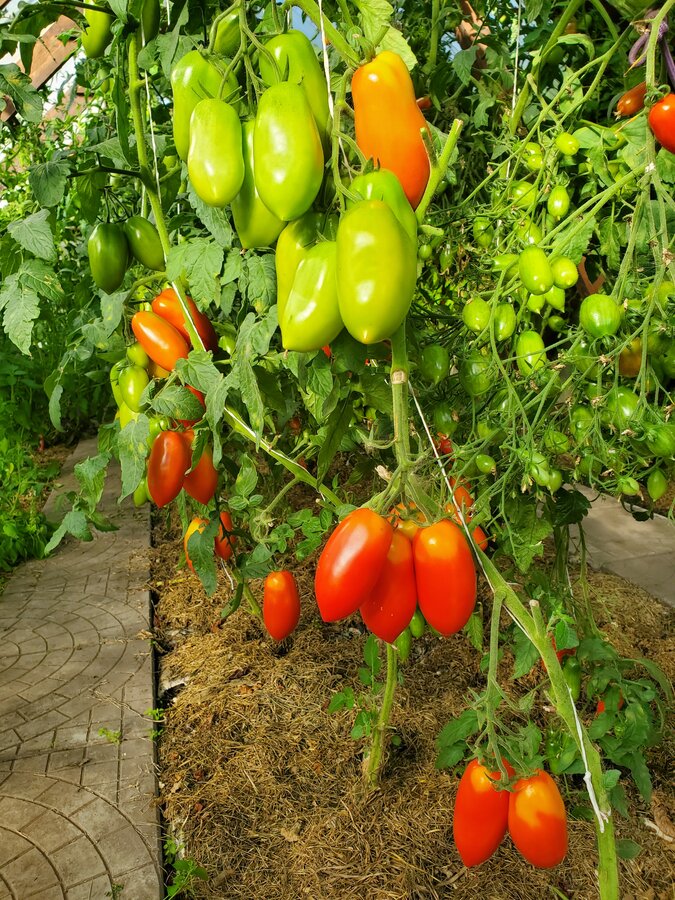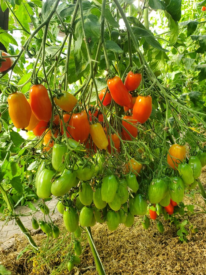 Гроздевой томат с длинными мелкими плодами, что- то среднее между сливками и черриками.